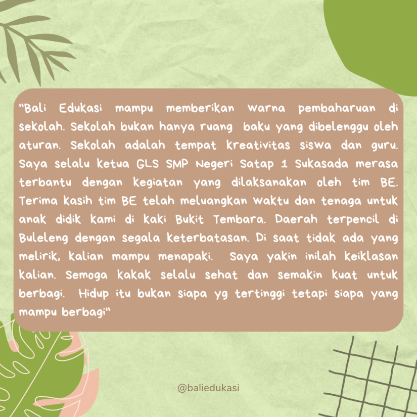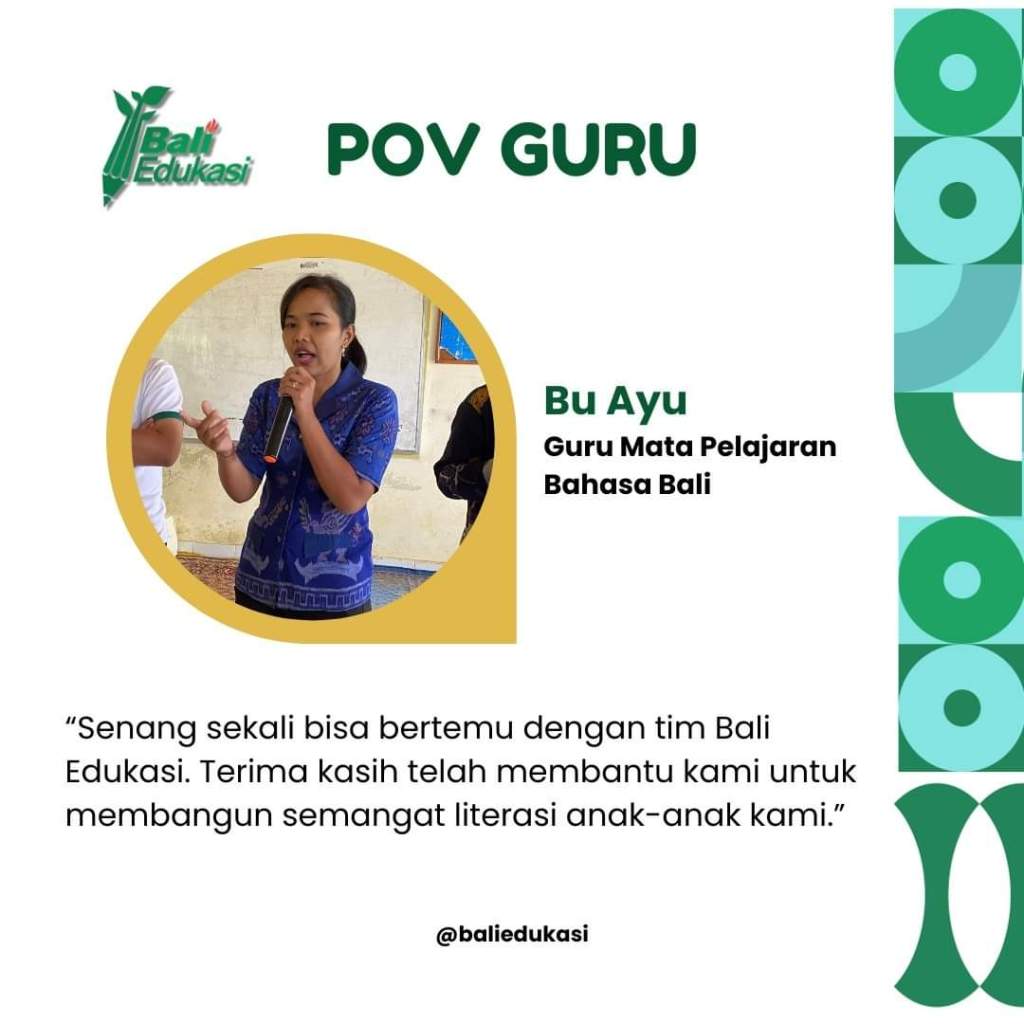 Setelah kilas balik kegiatan literasi di SMPN Satu Atap 1 Sukasada, yuk kita intip pengalaman dari Ibu Ayu, guru mata pelajaran Bahasa Bali SMP Negeri Satu Atap 1 Sukasada✨