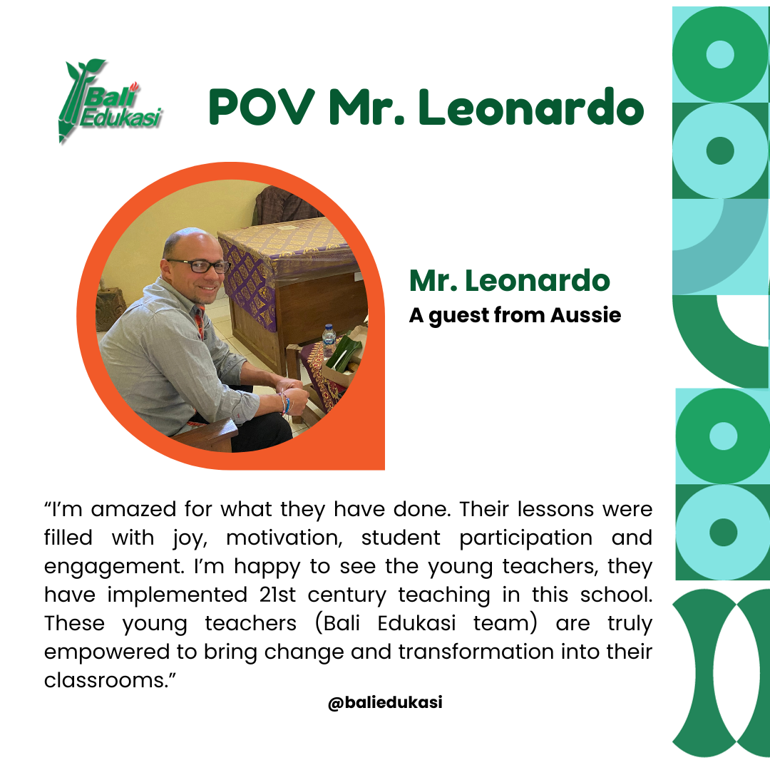 “One the life-changing experiences I’ve had while visiting Undiksha was to witness and experience the incredible community service activities that team members of Bali Edukasi are undertaking. While the community work they do, driven by passion, motivation, commitment and sacrifice, is fulfilling a community-oriented goal, what they actually do in the classroom is having a tremendous impact on their own professional lives, their professional identity and, most importantly, the lives of the children they are teaching voluntarily. Upon observing the implementation of the planned lessons, I was struck by how quickly and positively the dynamic of the lesson changed from the very moment teacher-volunteers got up to the front to teach their lessons. Their lessons were filled with joy, motivation, student participation and engagement. I was thrilled to see the intentional pedagogical changes these young teachers are making to their practice. Their eagerness to transform practice from traditionally teacher-centred pedagogies to student-centredness was evidently clear in their pursuits to implement 21st century teaching. These teachers are truly empowered to bring change and transformation into their classrooms.”